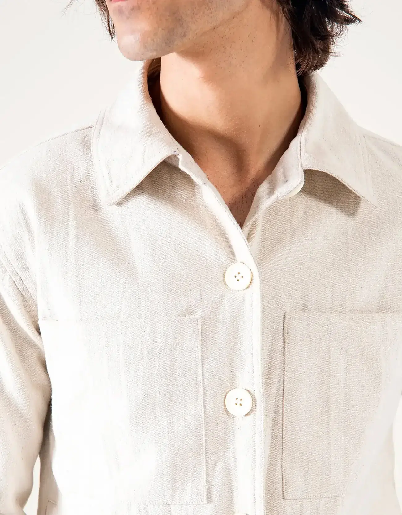Canvas button-down shirt collar shacket with front patch pockets. Long sleeves with buttoned cuffs. Front button closure.