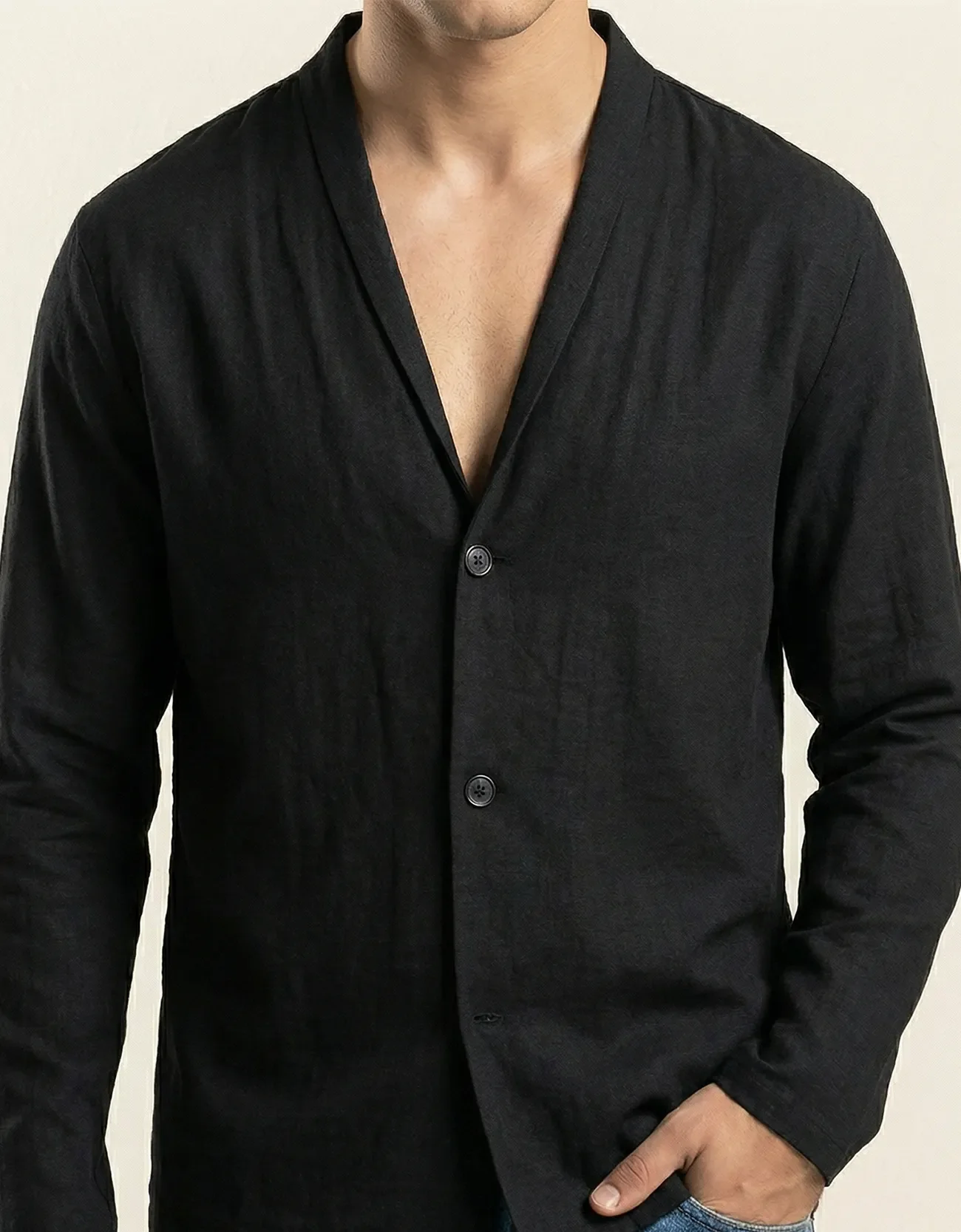 Loose fit coat style cross body linen shirt with front button closure and long sleeves.