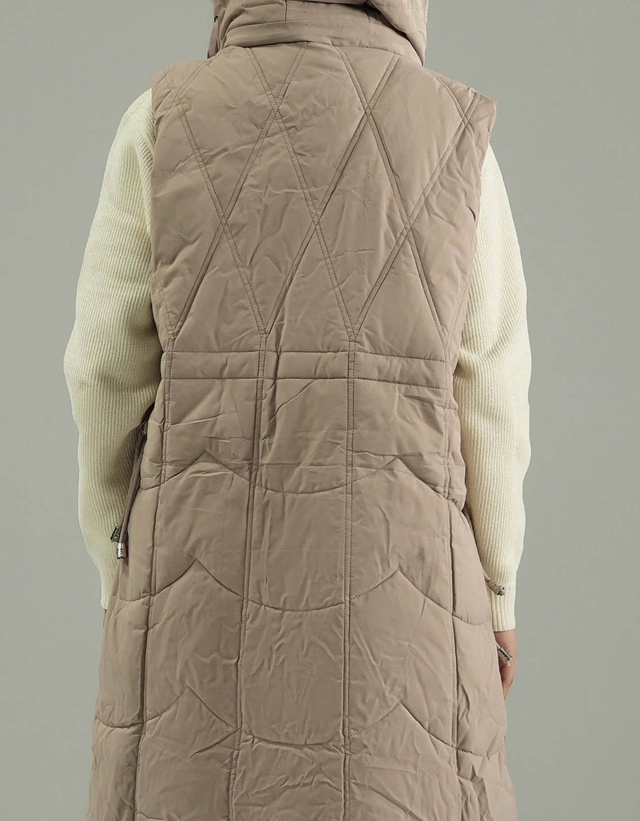 A loose-fit sleeveless puffer designed for versatile layering and everyday outerwear use. The neutral beige tone adds a refined touch while maintaining a practical, modern silhouette.