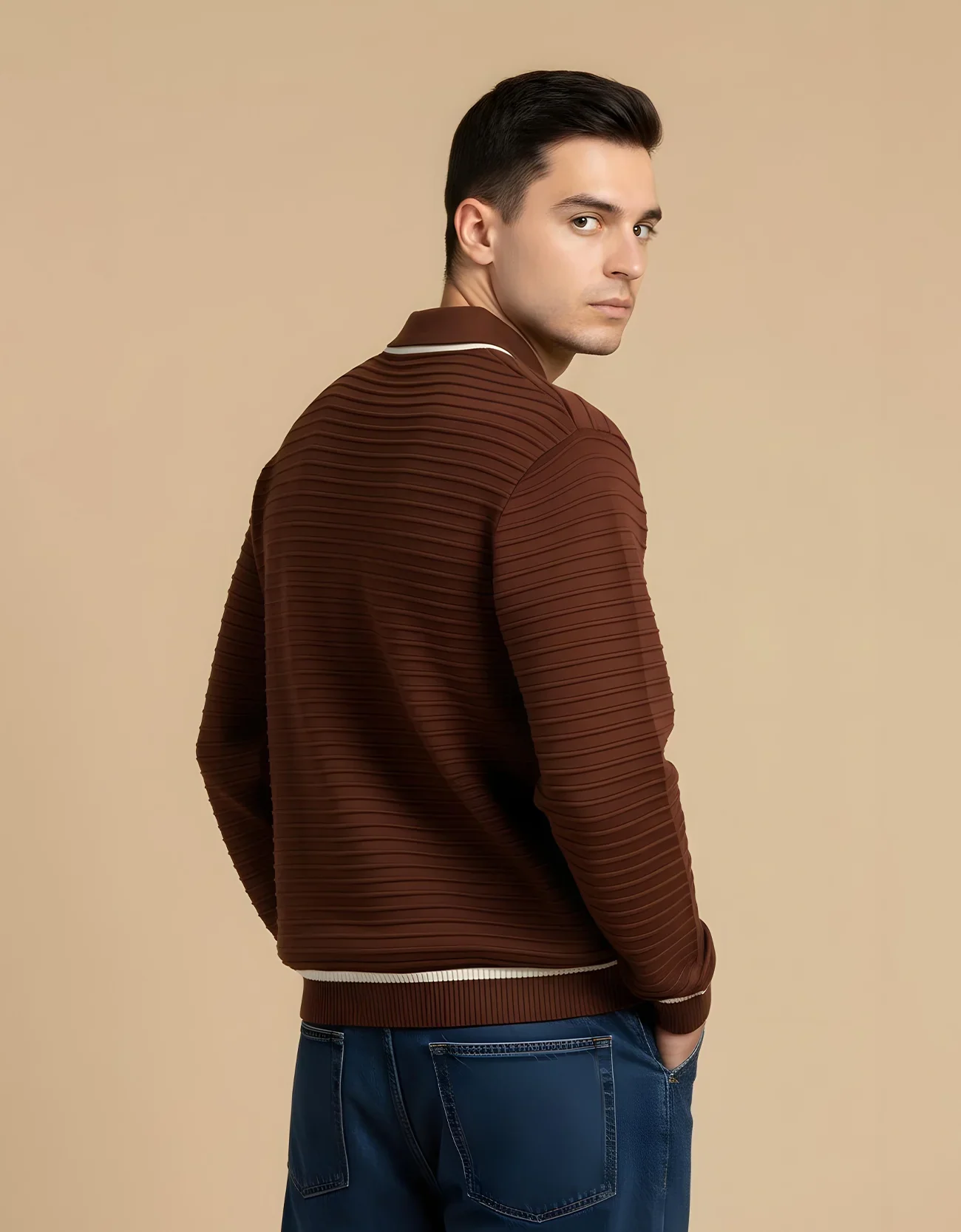 Regular fit stripe textured jhonny collar polo with contrast detail ribbed collar. Long sleeves with contrast rib detail at the cuff and hemline.