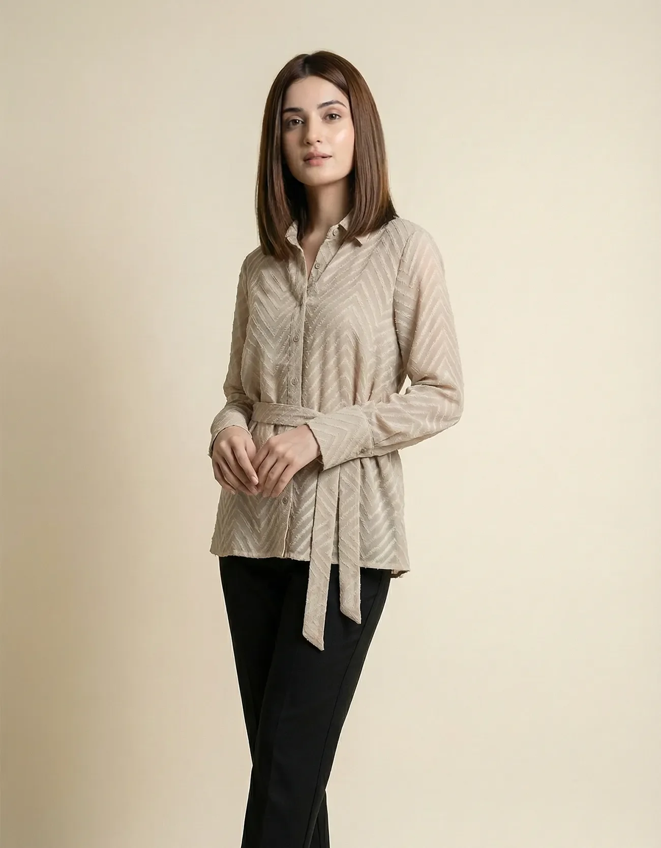 Loose fit shear paneled textured button-down shirt. Drop shoulder and long sleeves with cuffs. Front hemline with variable lengths. Detachable belt fastening at the waist.